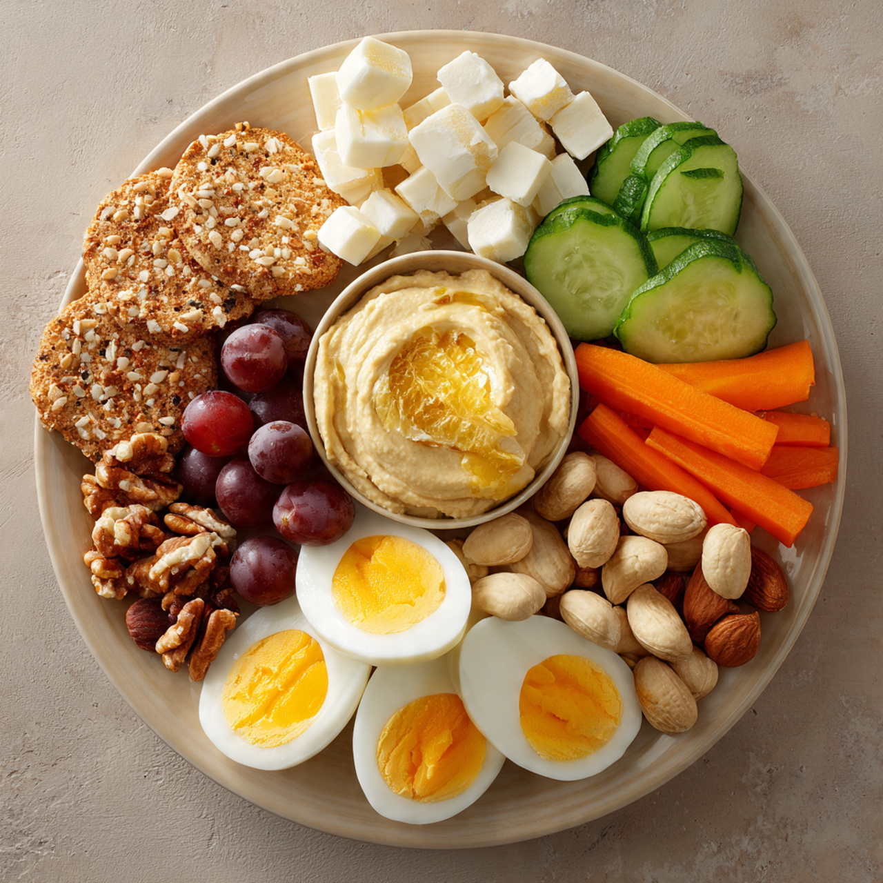 A proper snack plate includes protein, fat, and something fresh or crunchy. This combination supports fullness and steady energy.