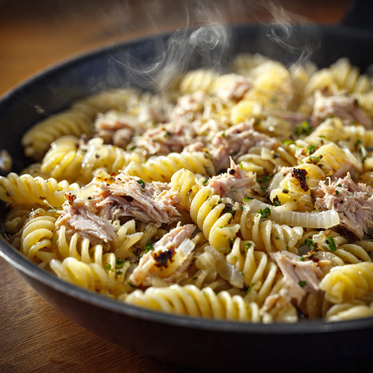 Boil the pasta. While it cooks, sauté onion or garlic in oil. Add drained tuna and warm it gently. Toss in the cooked pasta, season, and mix well.